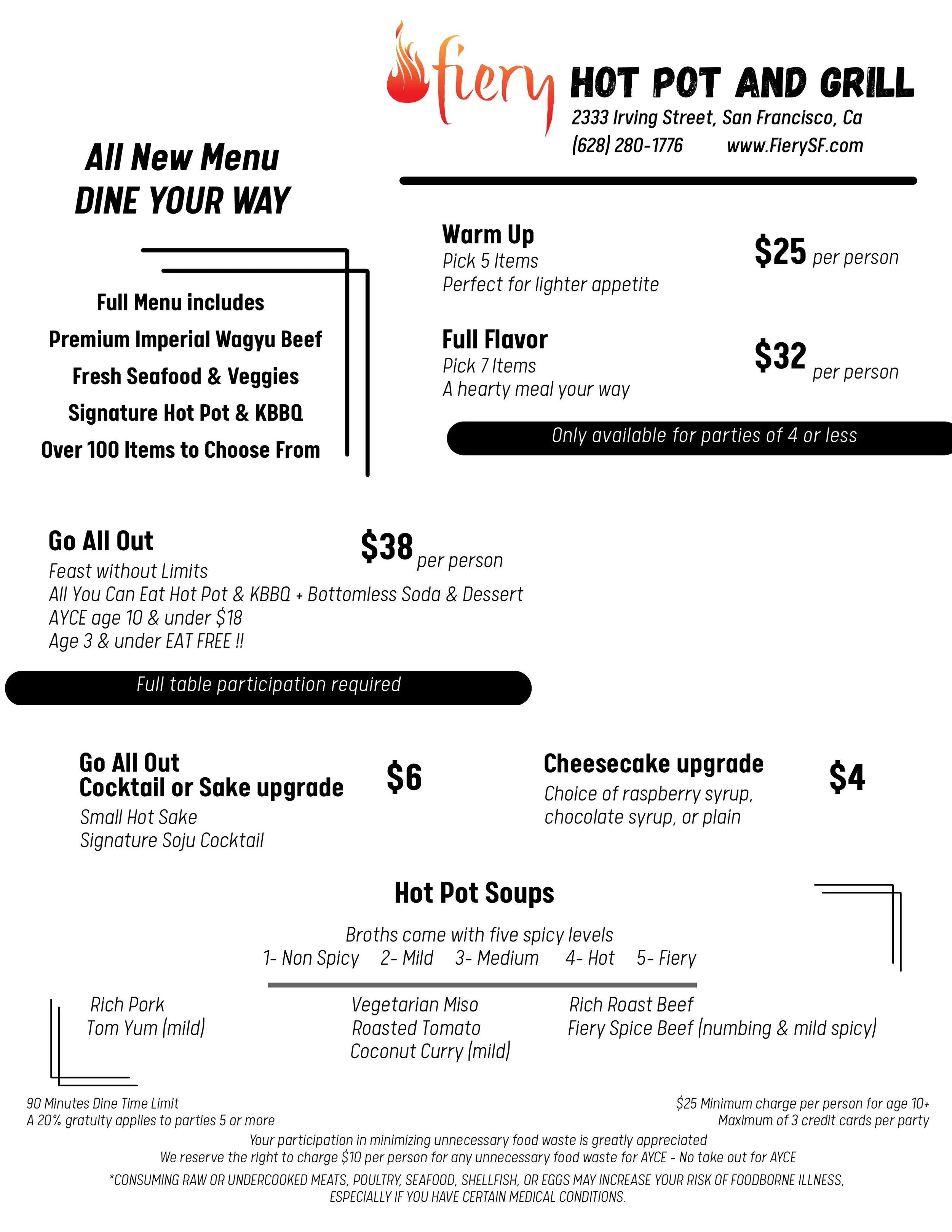 Step into the world of culinary craftsmanship at Fiery Hot Pot and Grill, we believe that the heart of an exceptional hot pot experience lies in its broth. That's why our broths are meticulously crafted in-house, simmering for 24 hours to achieve the perfect balance of flavors.. Rooted in a timeless recipe passed down through generations, our broths are a testament to our dedication to flavor and tradition. Each batch is infused with carefully selected ingredients, simmered slowly to unlock layers of rich, robust taste that will tantalize your palate. From the comforting warmth of our traditional broths to the bold and innovative flavors, every sip tells a story of culinary mastery. Join us on a journey of taste and tradition, where our house-made broths stand as a testament to our commitment to excellence in every bowl.